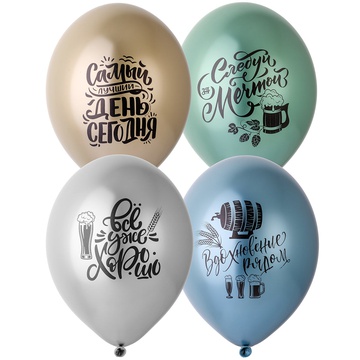 Высококачественный шар из натурального латекса. Хром Glossy - зеркально-глянцевый оттенок. Шары с двухсторонним шелкографическим ри сунком на тему - философия пива: Вдохновение рядом. Все уже хорошо. Следуй за мечтой. Самый лучший день - сегодня. Черный принит, большое поле печати. Идеальный ассортимент для розничной продажи воздушных шариков и украшения праздника. Воздушные шары изготавливаются из экологически безопасного 100%-ного натурального латекса. В окружающей среде разлагаются на безопасные компоненты примерно с той-же скоростью, как обычные листья деревьев. После использования лопнуть и утилизировать как бытовой отход.